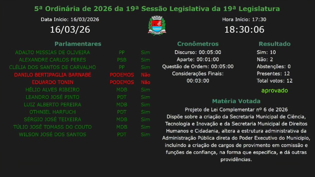 O Projeto de Lei Complementar nº 06/2026 recebeu 10 votos favoráveis e 2 contrários entre os 12 vereadores presentes na votação. Votaram a favor Adalto Missias (PP), Alexandre Peres (PSB), Clélia dos Santos (PP), Hélio Ribeiro (MDB), Leandro Pinto (PDT), Cebolinha (MDB), Dr. Othniel (PDT), Professor Sérgio (MDB), Túlio Tomass (MDB) e Índio da 12 (PDT). Já os votos contrários foram dos vereadores Danilo Barnabé (Podemos) e Eduardo Tonnin (Podemos).