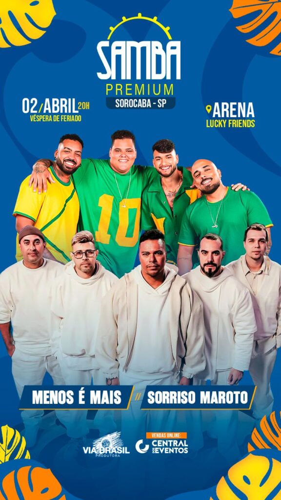 Os grupos Sorriso Maroto e Menos é Mais vão se apresentar em um festival de pagode no dia 2 de abril, na Arena Lucky Friends, em Sorocaba (SP). A produção do evento é assinada pela Via Brasil Produtora.